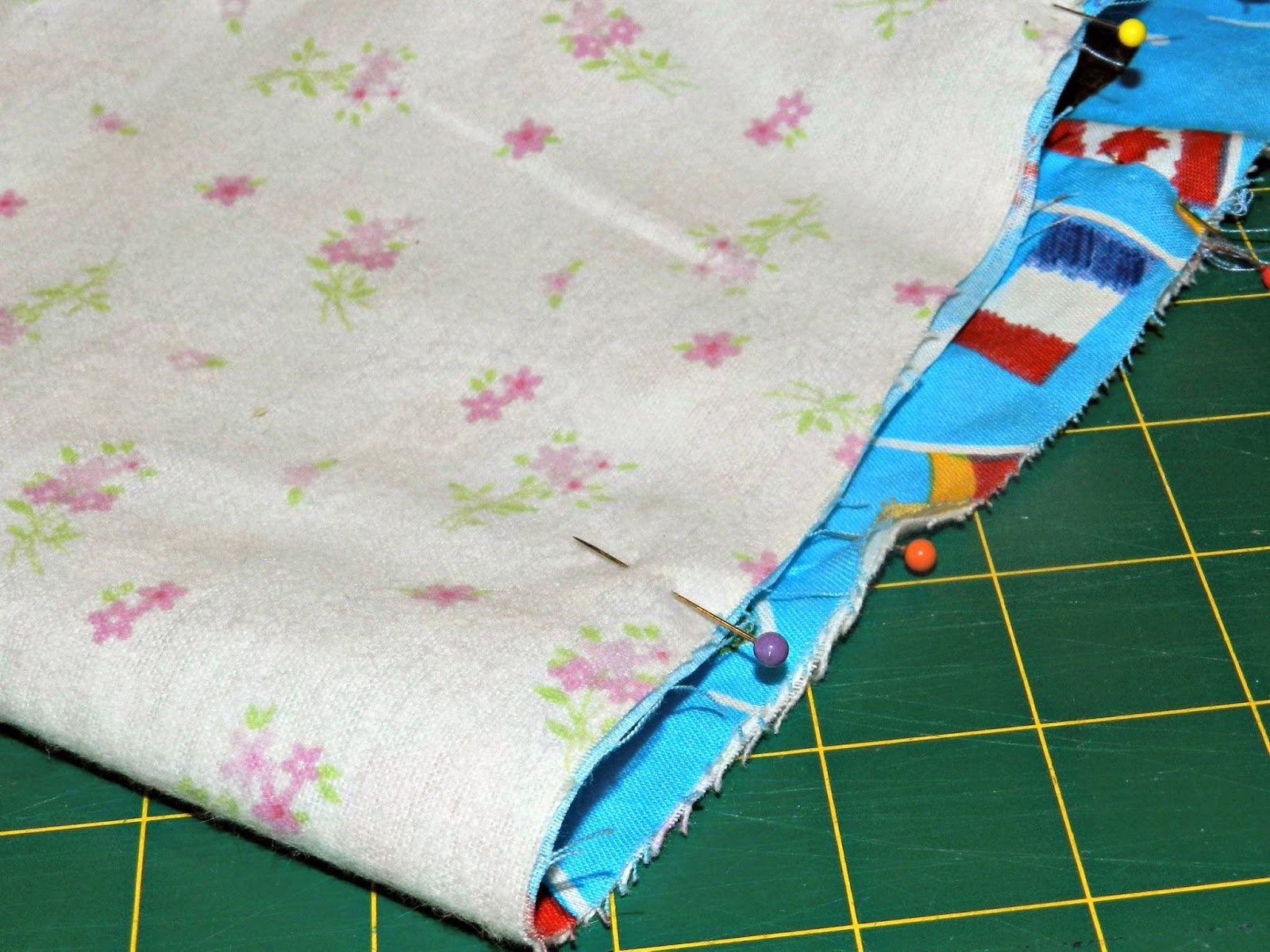 * With the outer fabric right way out, and the lining fabric wrong side out, place the lining inside the outer fabric with their wrong sides together. Match front and rear seams and smooth out along top edge and baste together using a 6mm (1/4") seam allowance.