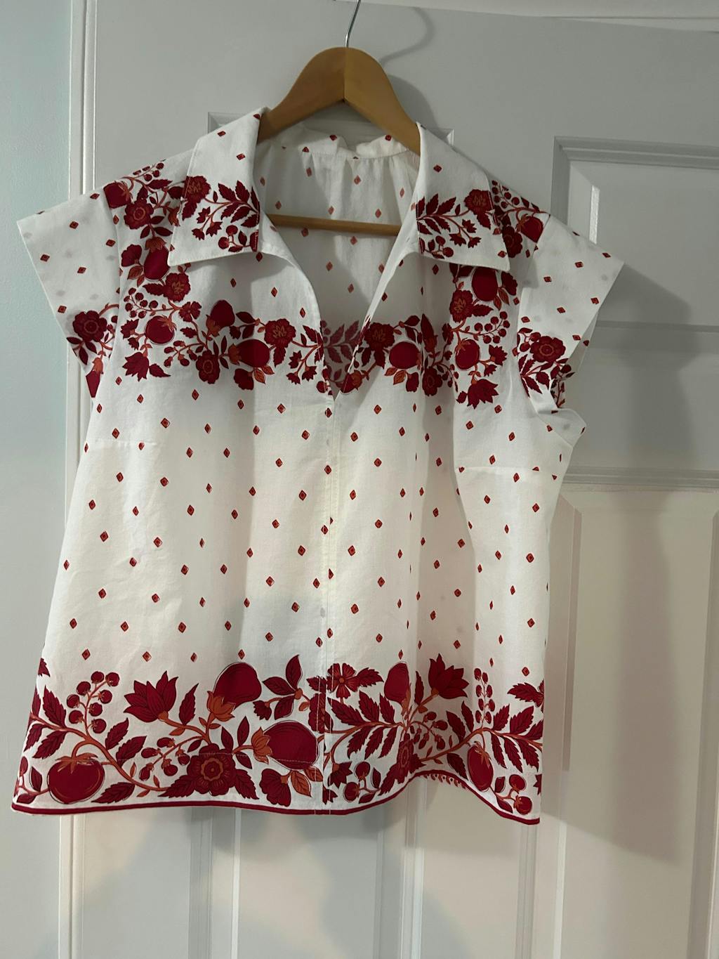 Love my cap sleeve top I made with a recycled tablecloth. My toile was too large & I had to size down to a 10. I initially used size 14 with FBA-2. Still used the FBA-2. I find your ease is very generous.