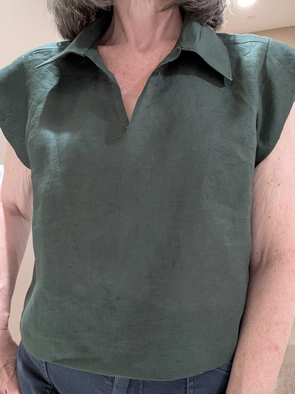 For my first version, I used a forest green linen. At 5' tall, I made my usual length adjustments, although I shortened it just a bit too much and ended up with a narrower hem than intended. Even so, I love how the shirt fits and wears.