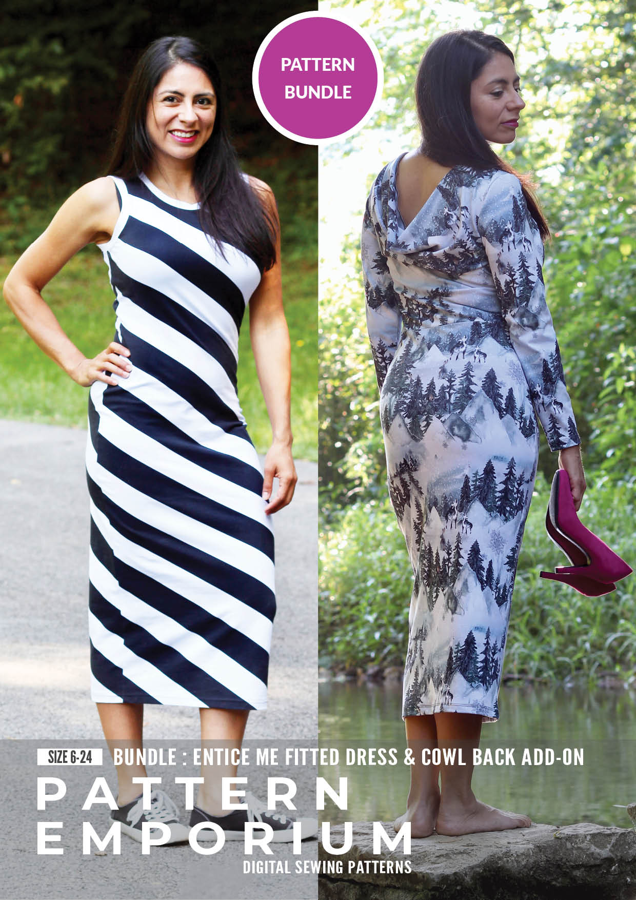 DressThis sewing pattern bundle contains both the Entice Me Fitted Dress and the Cowl Back Add-on patterns.