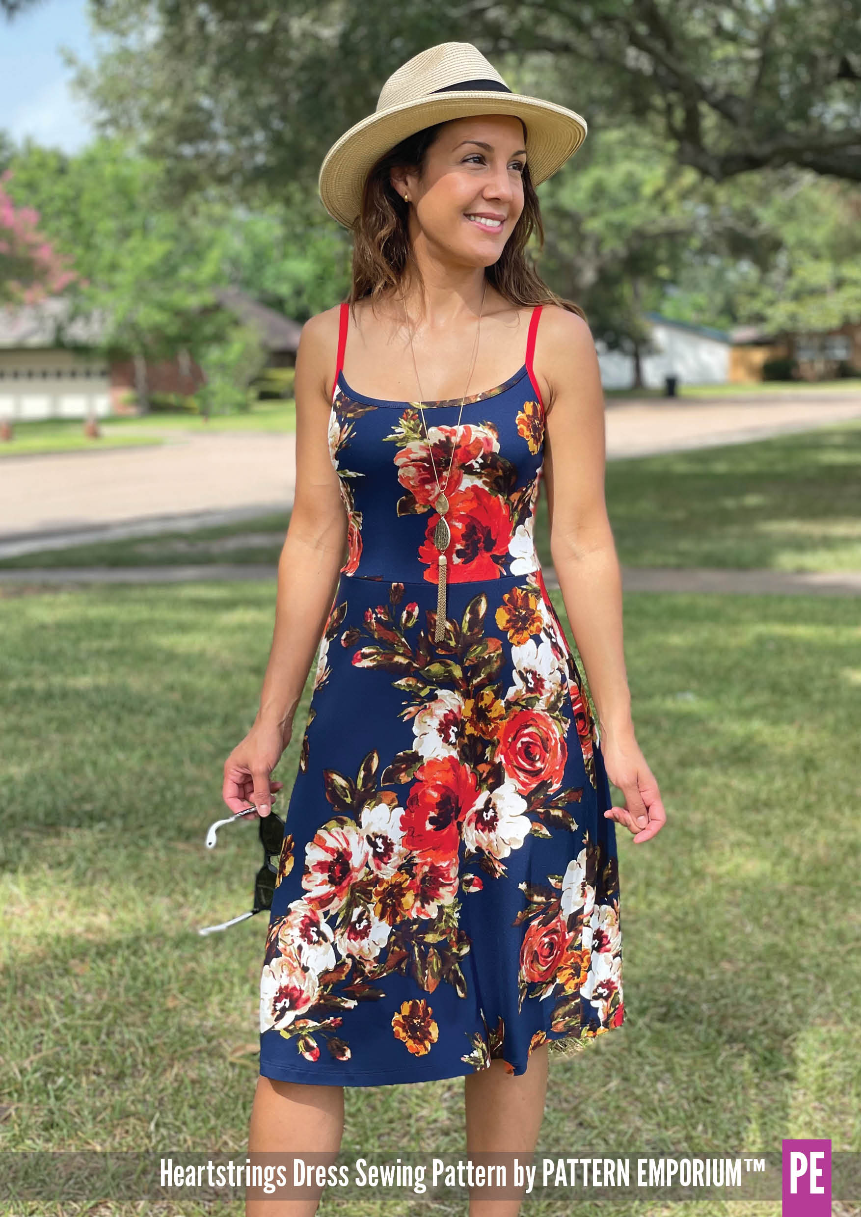 The Heartstrings Dress is a fit & flare style featuring a fitted bodice with narrow or wide straps, waist seam & A-line skirt. It is designed for stretch knit fabrics & includes an optional shelf bra that you're going to love!