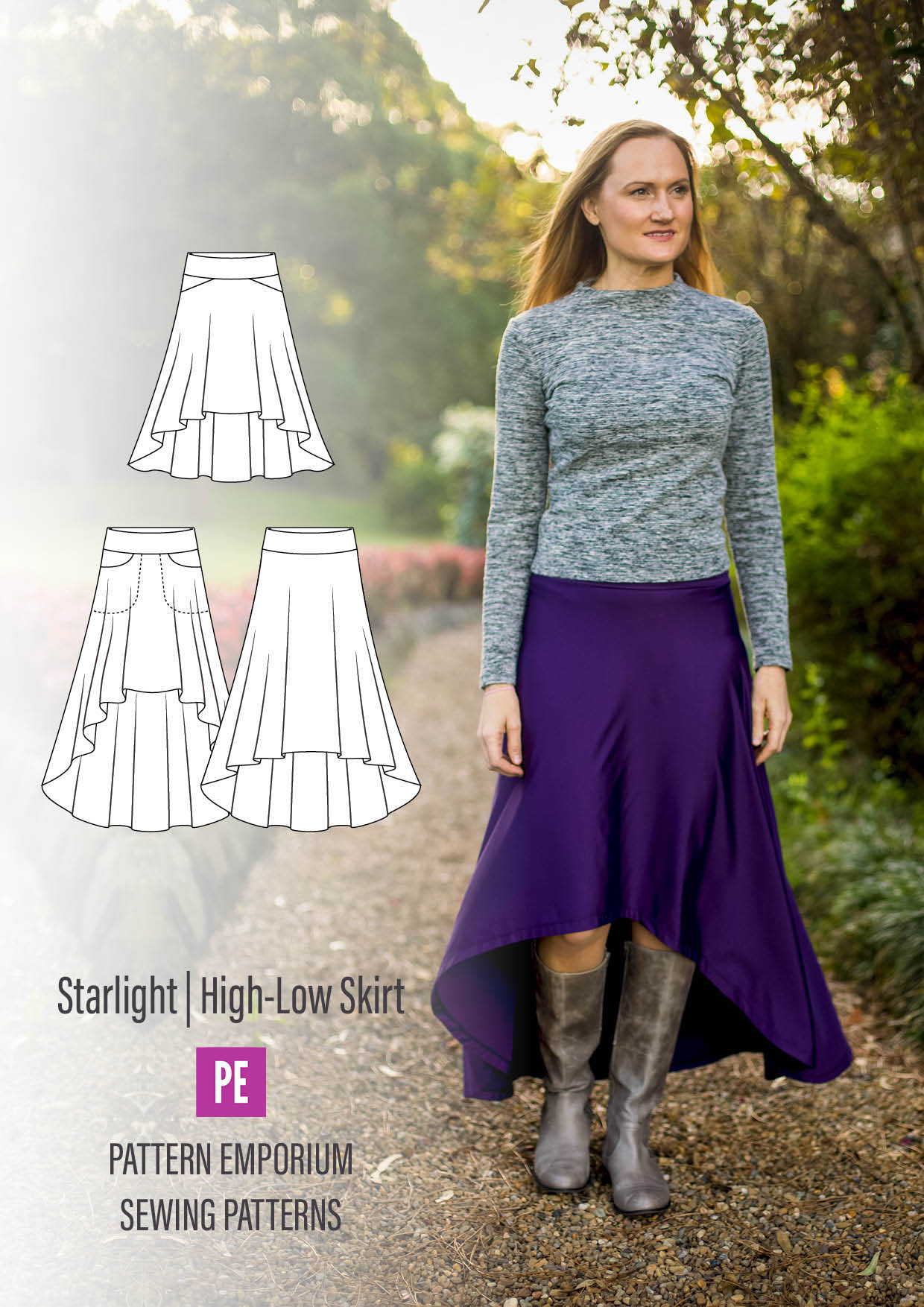 The Starlight High-Low Skirt is designed for stretch knit fabrics. With pull-on waist & optional pocket, it features a raised front hemline & lowered back hemline on a wide flared silhouette.