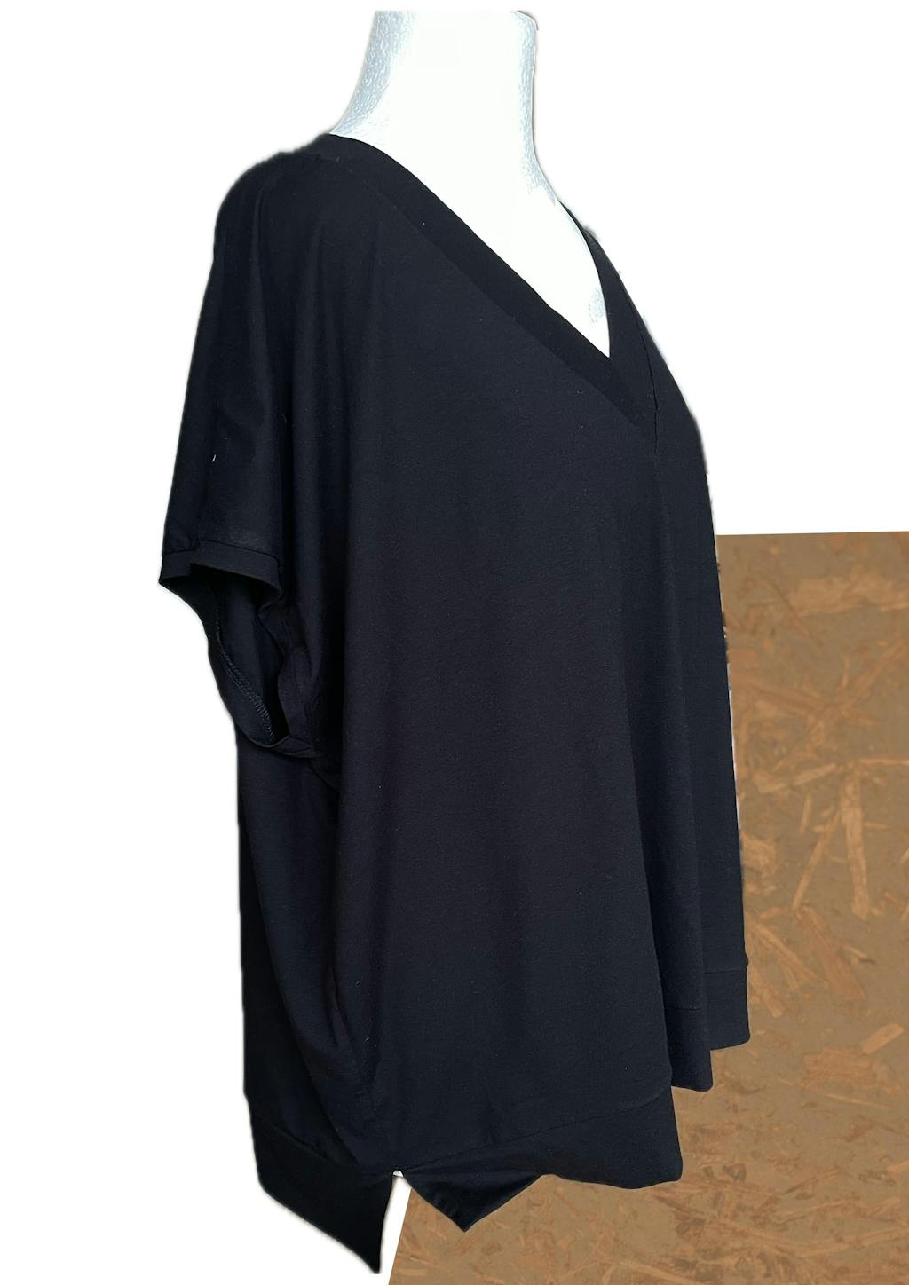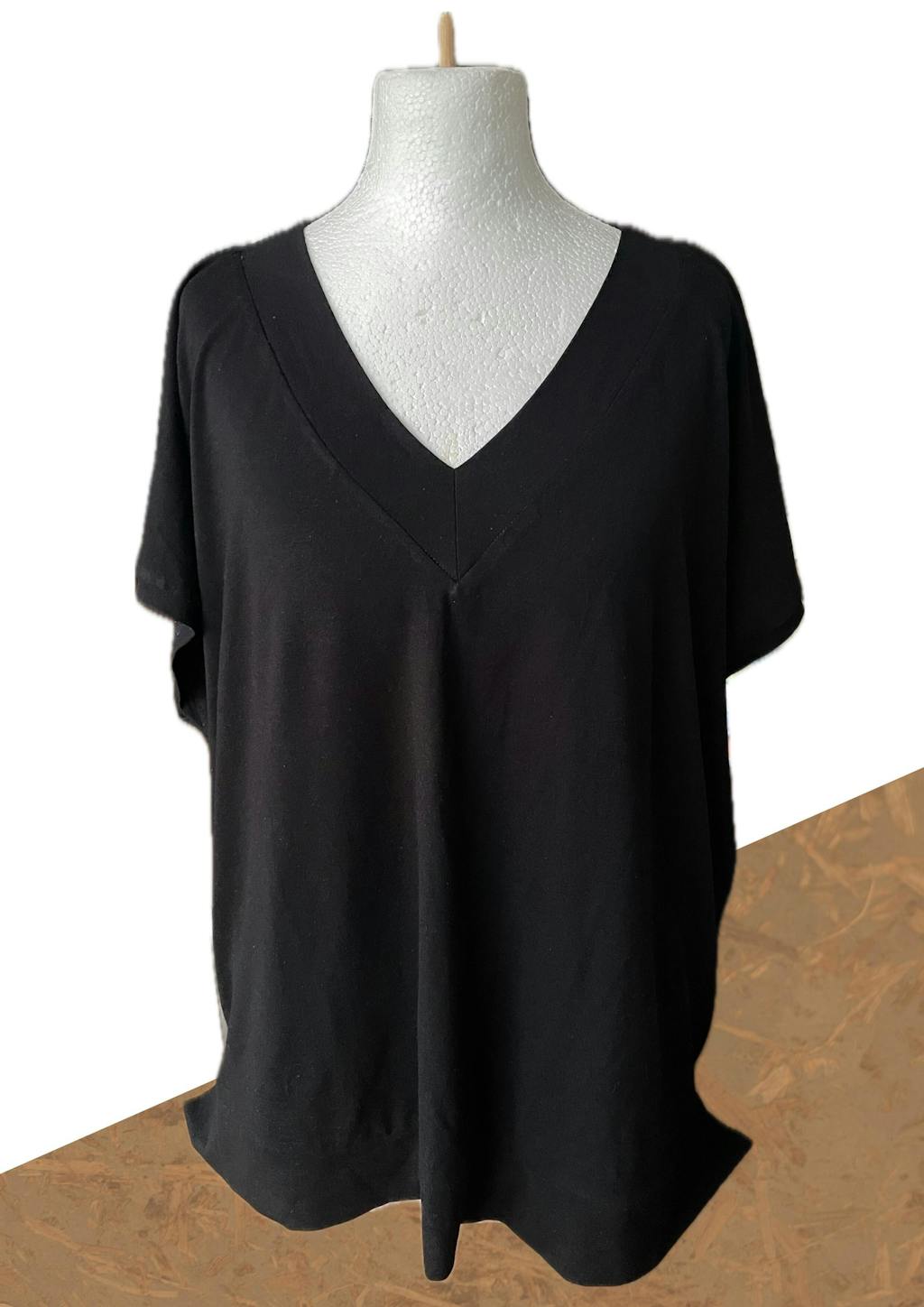 I made this pattern out of a bigger viscose jersey scrap. It was big enough to make a version without sleeves. Either this fabric I you’d call it a T-shirt But I’m planning on another with sleeves in French terry. An easy to wear and combine garment. I only have pictures on a kind of tempex dress form (not my size). I removed the background. It was distracting
